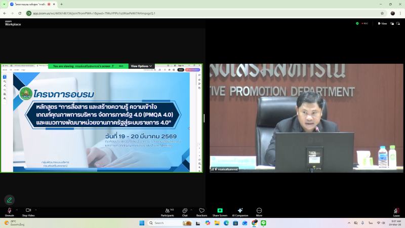 วันที่ 19-20 มีนาคม 2569 นายพิษณุ ยุวรรณา รักษาการผู้อำนวยการศูนย์ถ่ายทอดเทคโนโลยีการสหกรณ์ที่ 19 มอบหมายให้นางสาวปานฟ้า พรหมแก้ว นักทรัพยากรบุคคลปฏิบัติการ เข้าร่วมโครงการอบรมหลักสูตร “การสื่อสาร และสร้างความรู้ความเข้าใจ เกณฑ์คุณภาพการบริหาร จัดการภาครัฐ 4.0 (PMQA 4.0) และแนวทางพัฒนาหน่วยงานภาครัฐสู่ระบบราชการ โดยมี นายณฤทธิ์ บุญชัย รองอธิบดีกรมส่งเสริมสหกรณ์ เป็นประธานในพิธีเปิด และมี นางสาวปรานอม จันทร์ใหม่ ผู้ทรงคุณวุฒิด้านการสหกรณ์ เลขานุการกรม ผู้เชี่ยวชาญ ผู้อำนวยการกลุ่ม และเจ้าหน้าที่ที่เกี่ยวข้อง เข้าร่วม ถ่ายทอดสดผ่านระบบ Zoom Meeting ณ ห้องประชุม 226 กรมส่งเสริมสหกรณ์ เทเวศร์ กรุงเทพมหานคร